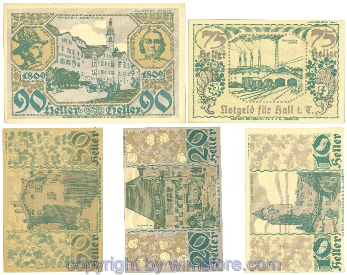 Hall in Tirol, Prv. Gesellschaft Einsiedler, J00343a, Serie 10, 20, 50, 75, 90 Heller; -1