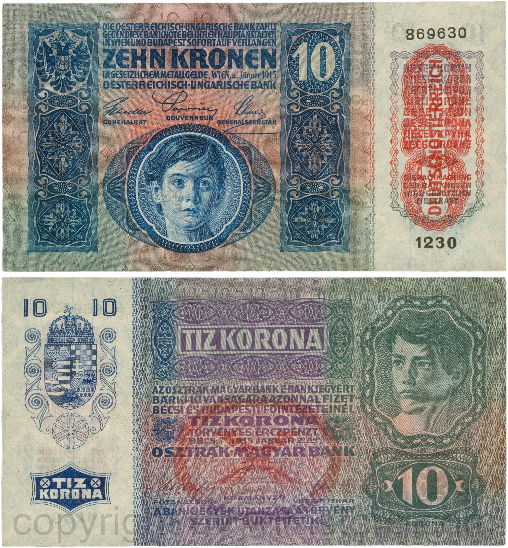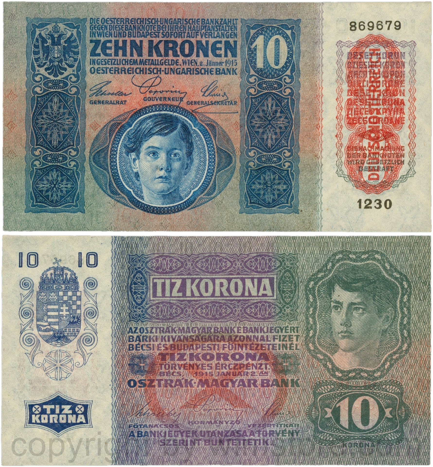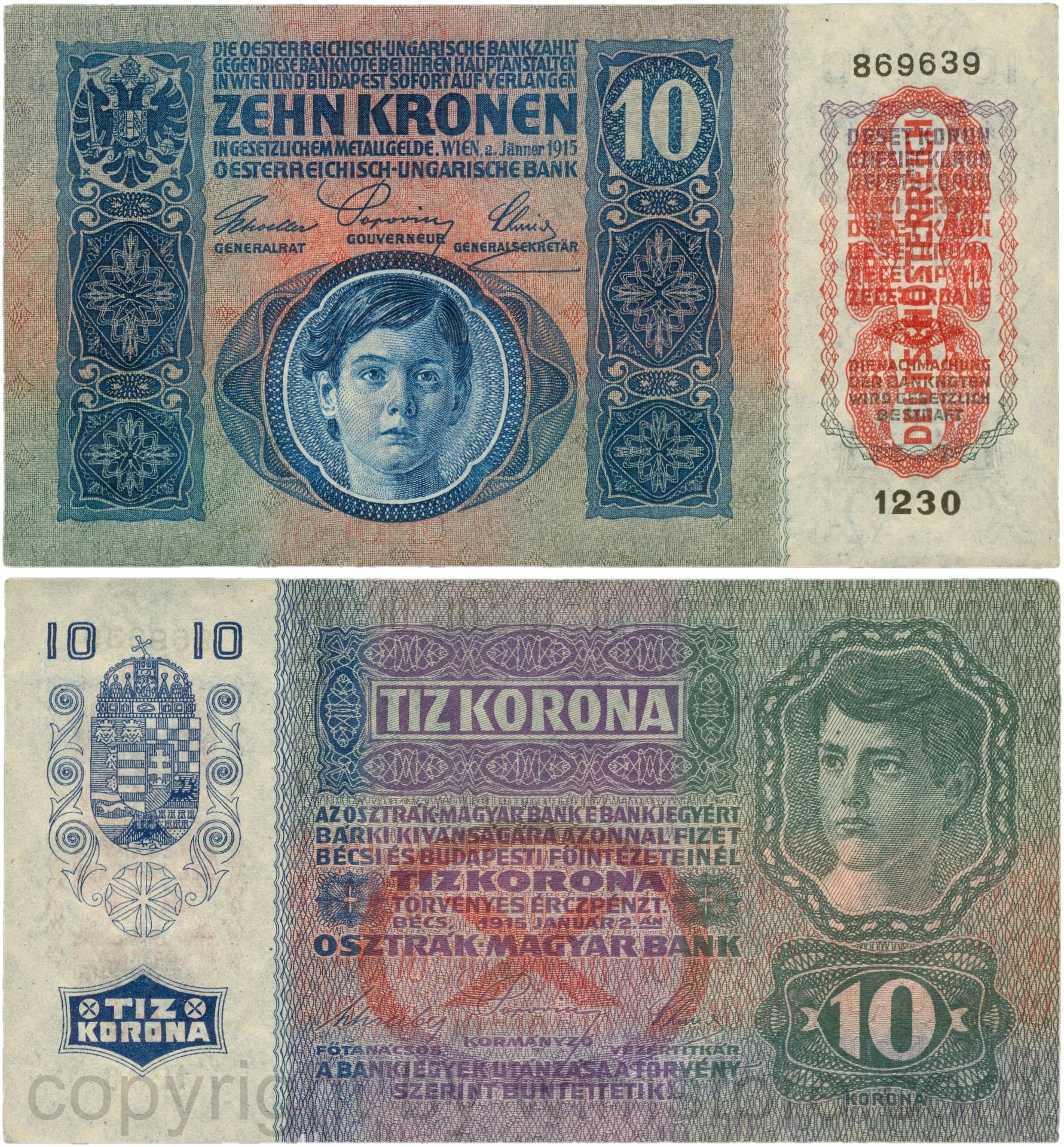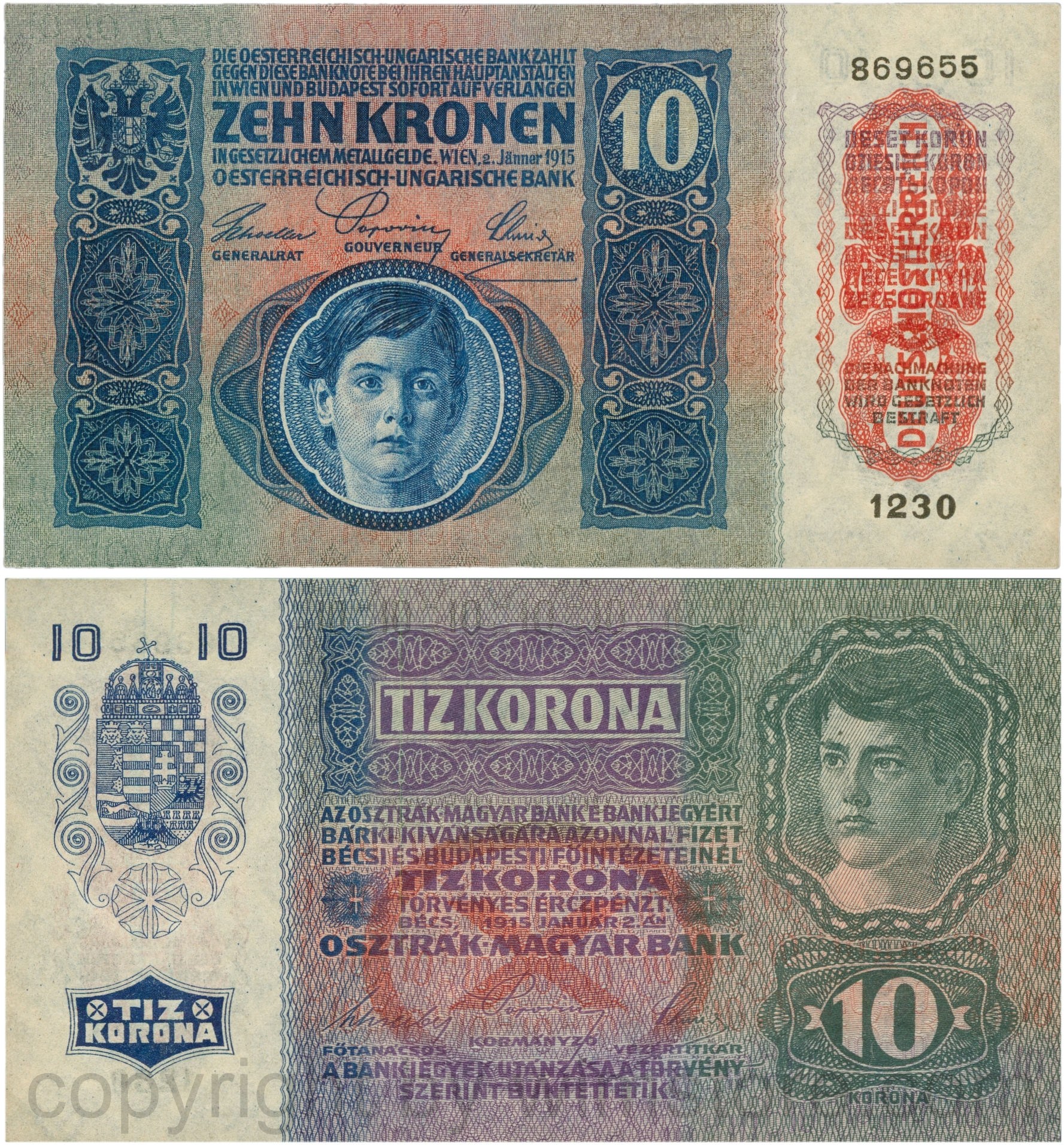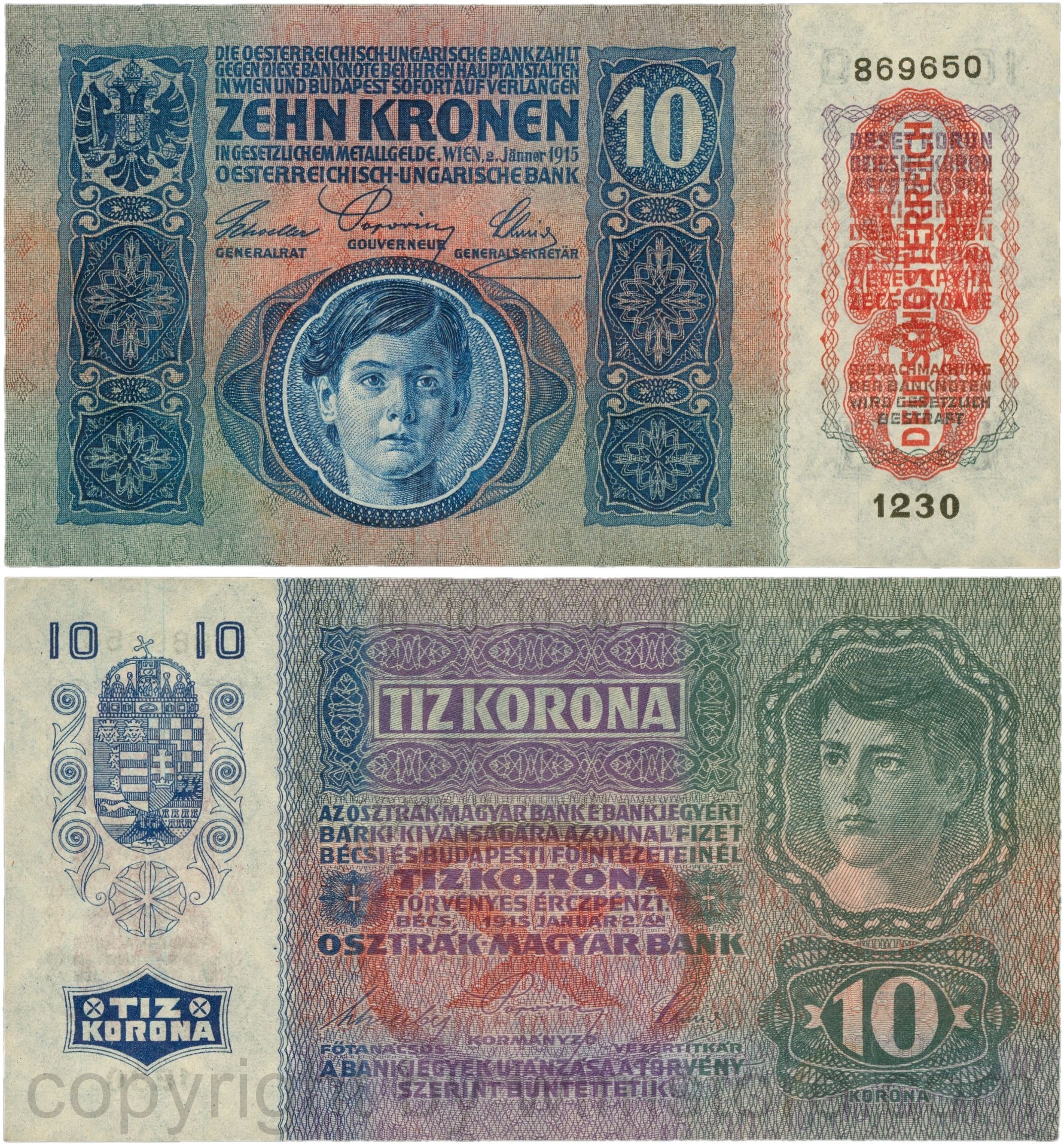 Österreich, 1. Republik, P051a.1, 10 Kronen 2.Jänner 1915 mit Aufdruck "DEUTSCHÖSTERREICH" (1919), Tiefdruck (engraved printing); 4 Originalfoto.