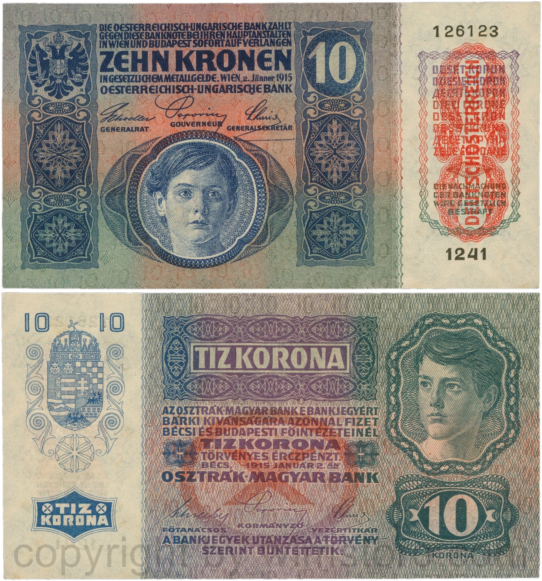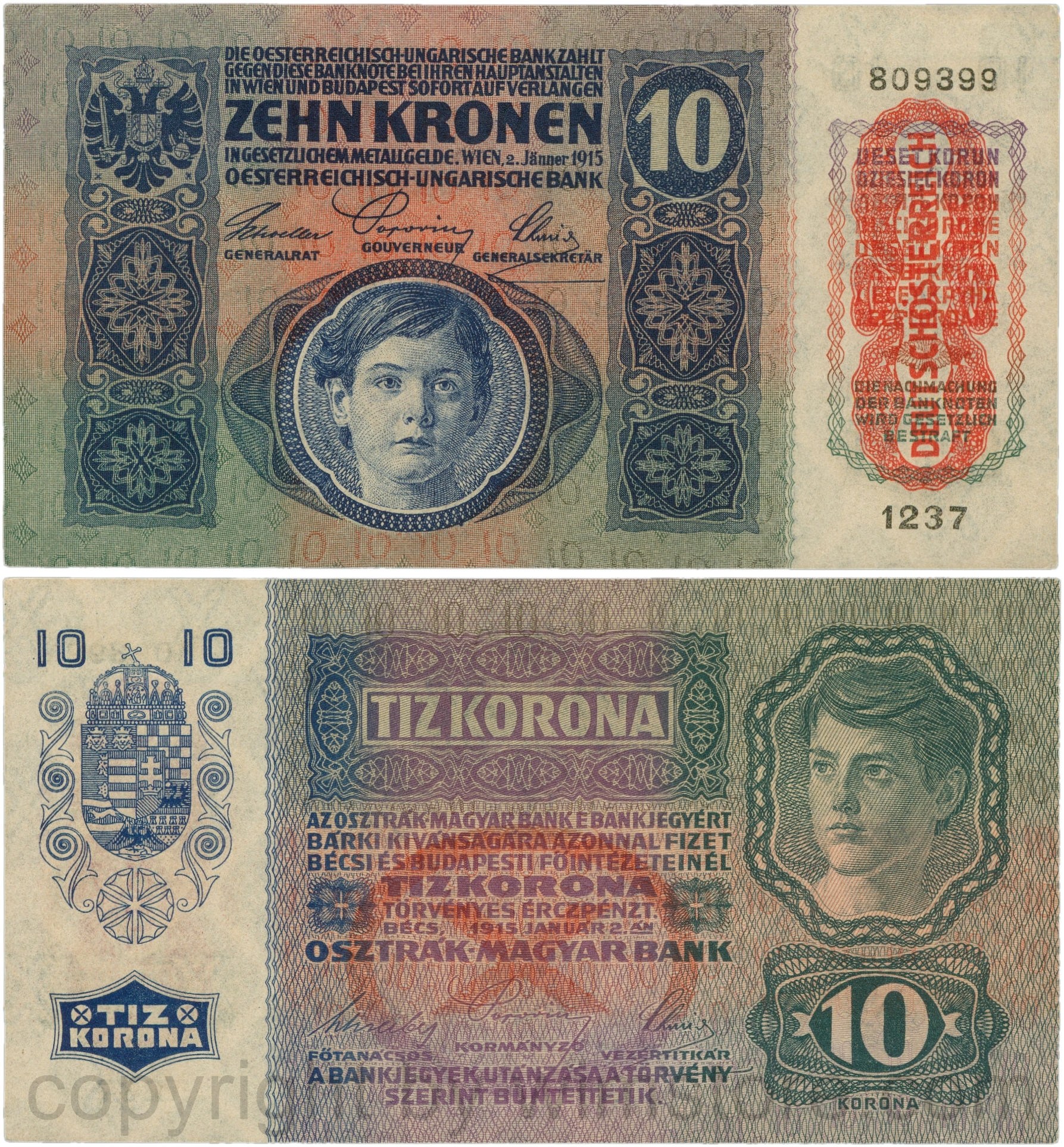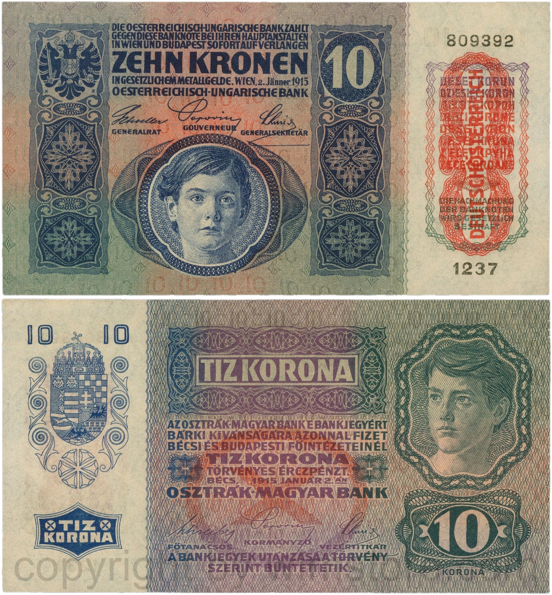 Österreich, 1. Republik, P051a.2, 10 Kronen 2.Jänner 1915 mit Aufdruck "DEUTSCHÖSTERREICH" (1919), Flachdruck (lithographed printing); 2 Originalfoto.