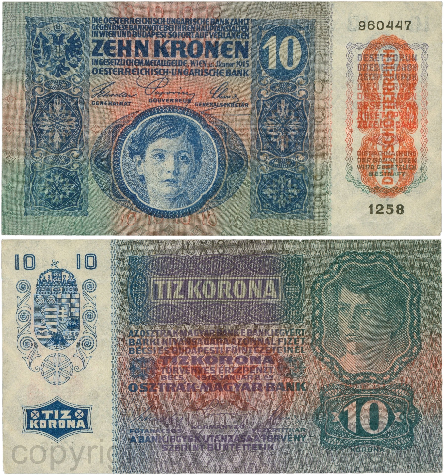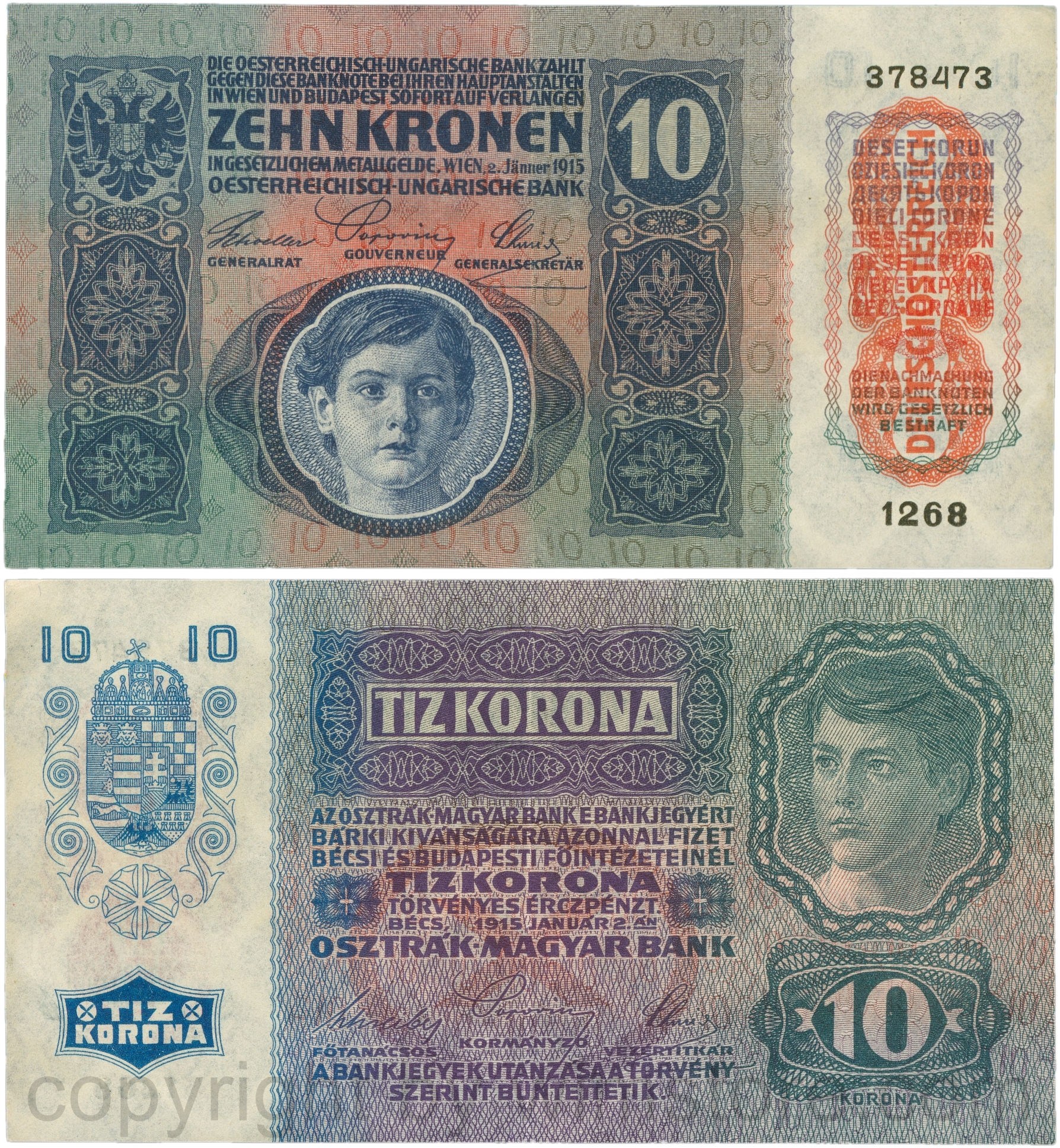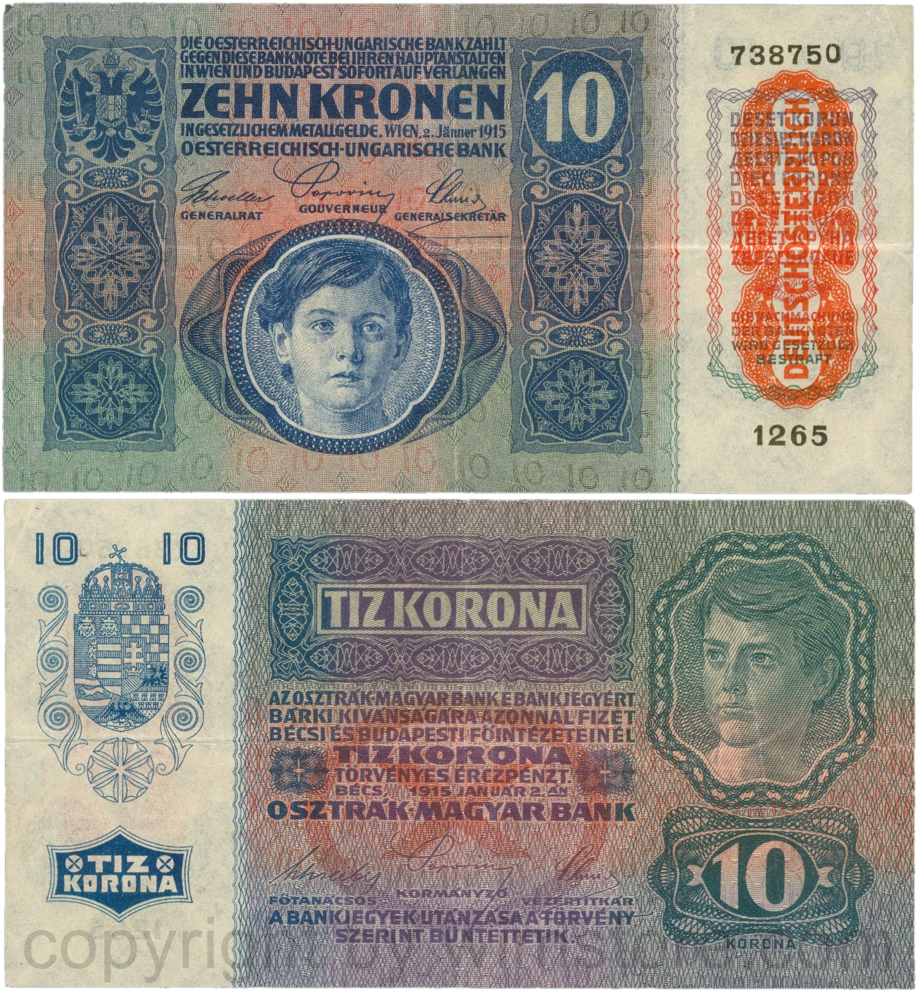 Österreich, 1. Republik, P051a.2, 10 Kronen 2.Jänner 1915 mit Aufdruck "DEUTSCHÖSTERREICH" (1919), Flachdruck (lithographed printing); 2 Originalfoto.
