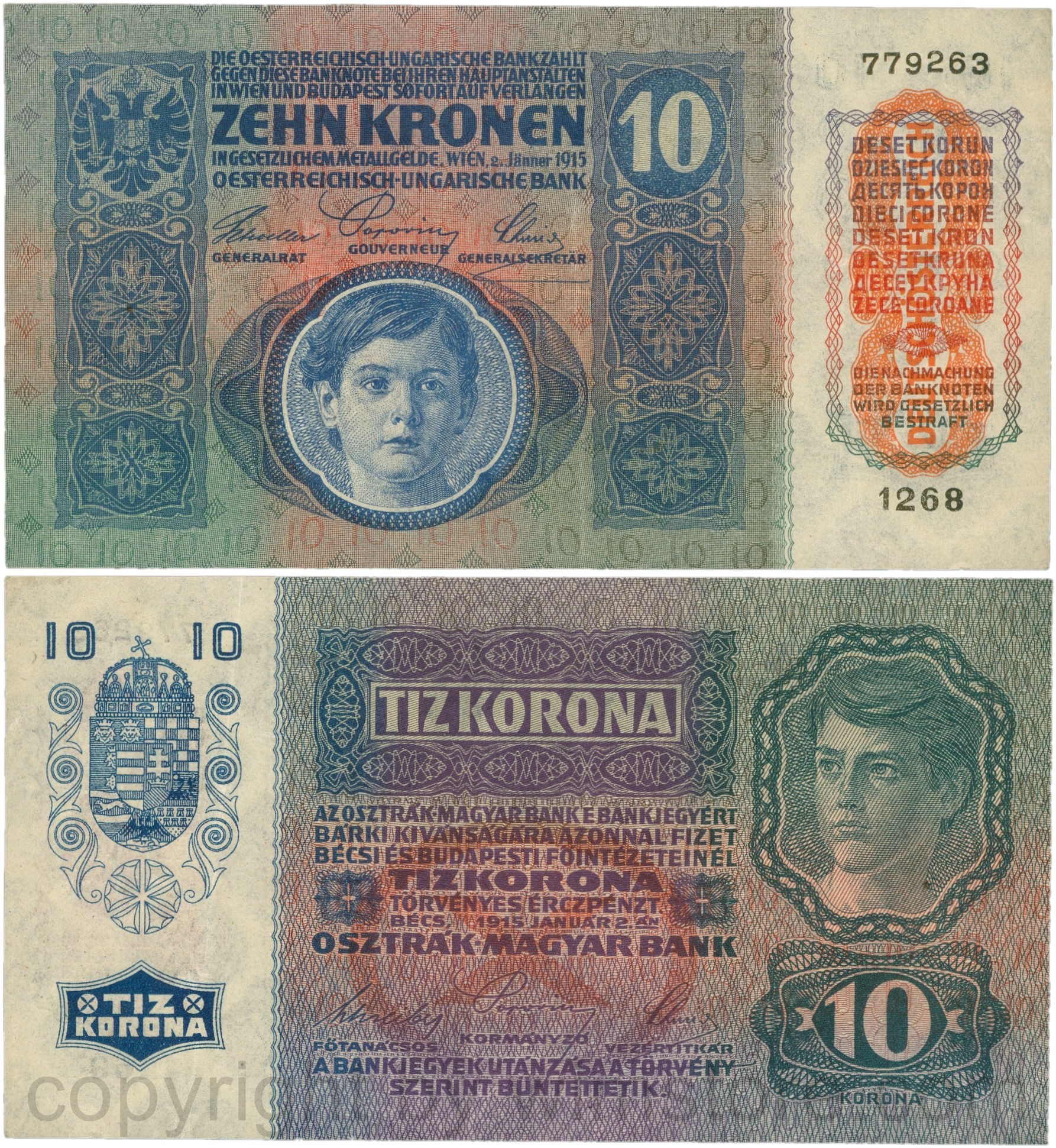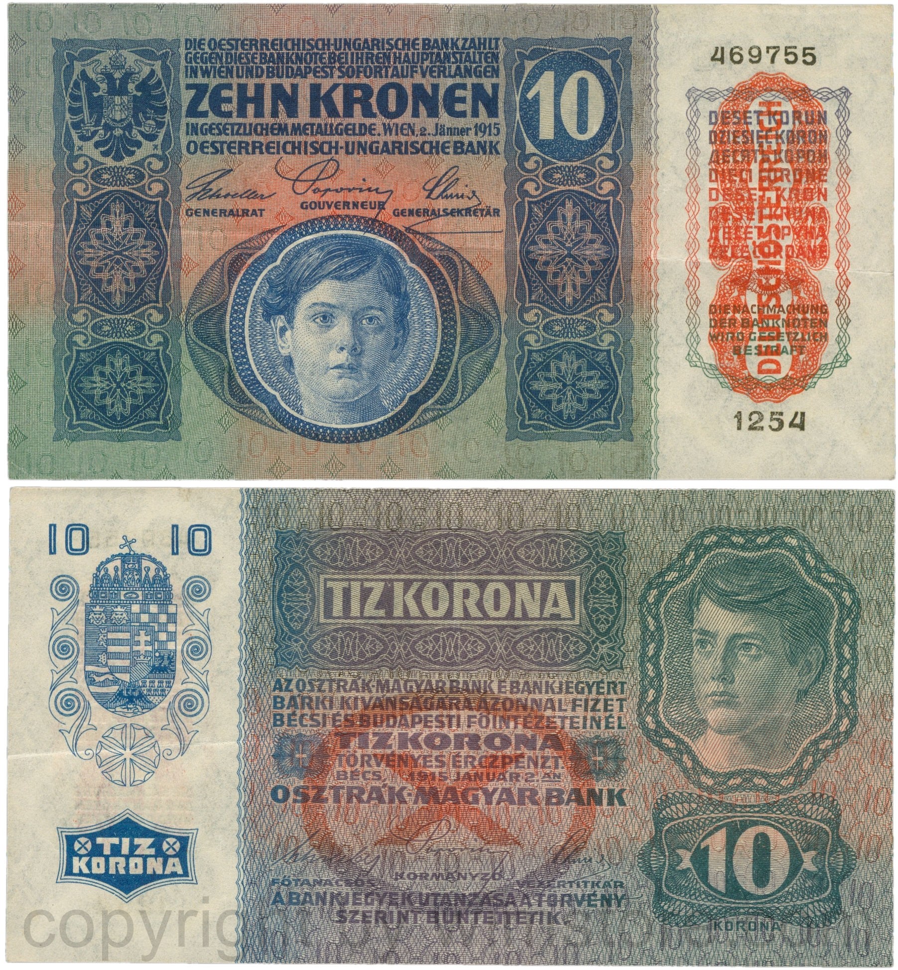 Österreich, 1. Republik, P051a.2, 10 Kronen 2.Jänner 1915 mit Aufdruck "DEUTSCHÖSTERREICH" (1919), Flachdruck (lithographed printing); 4 Originalfoto.
