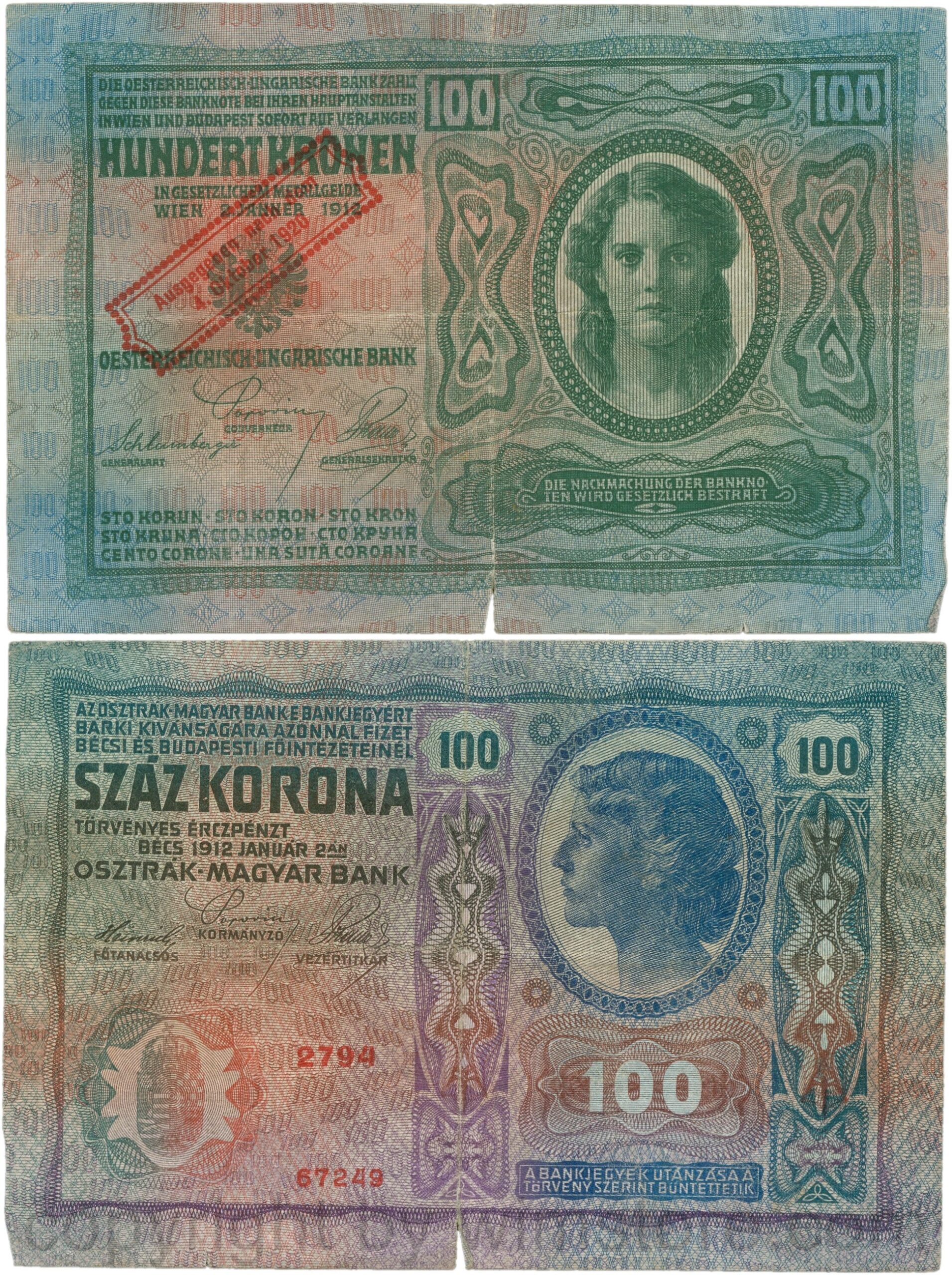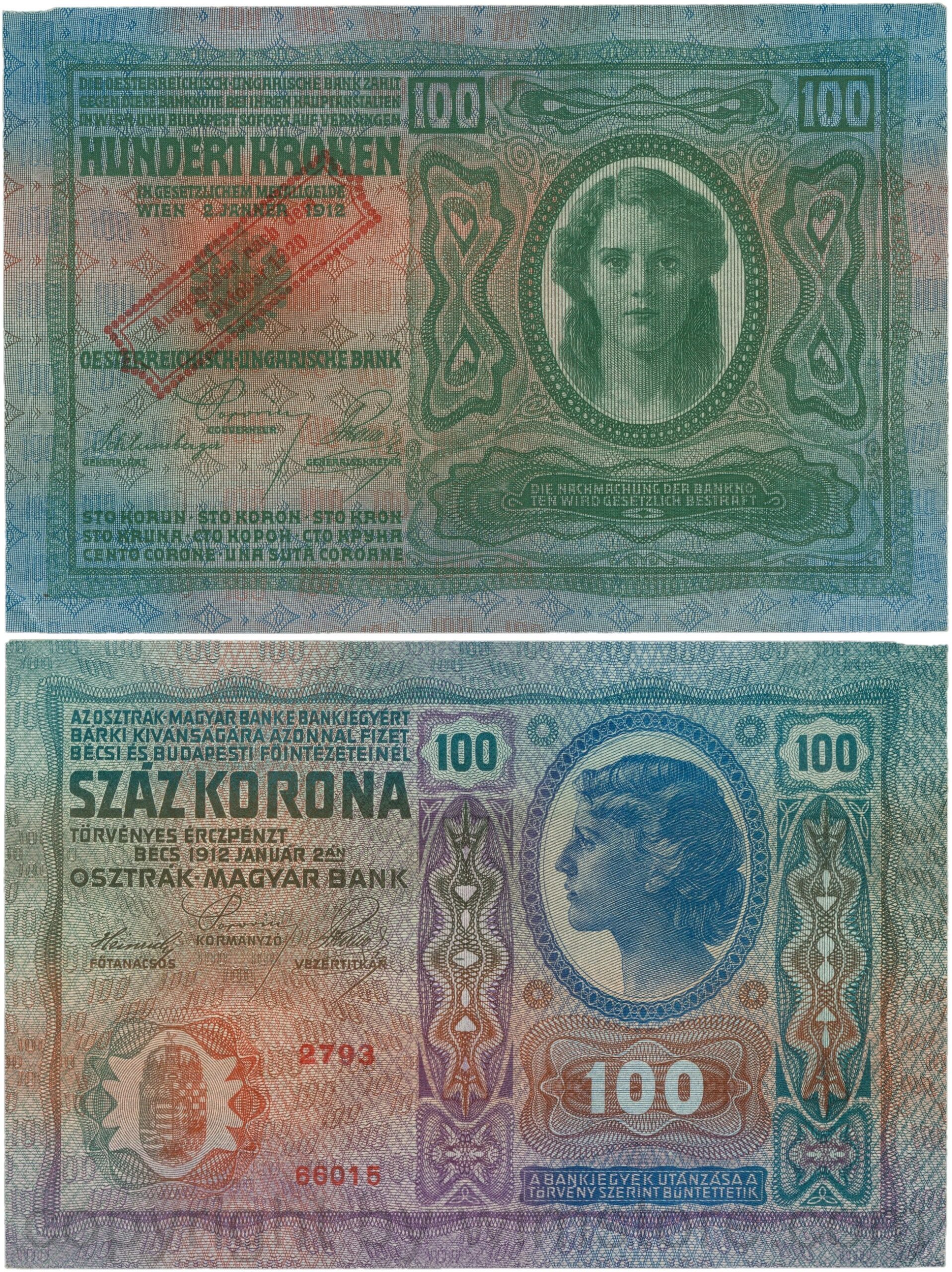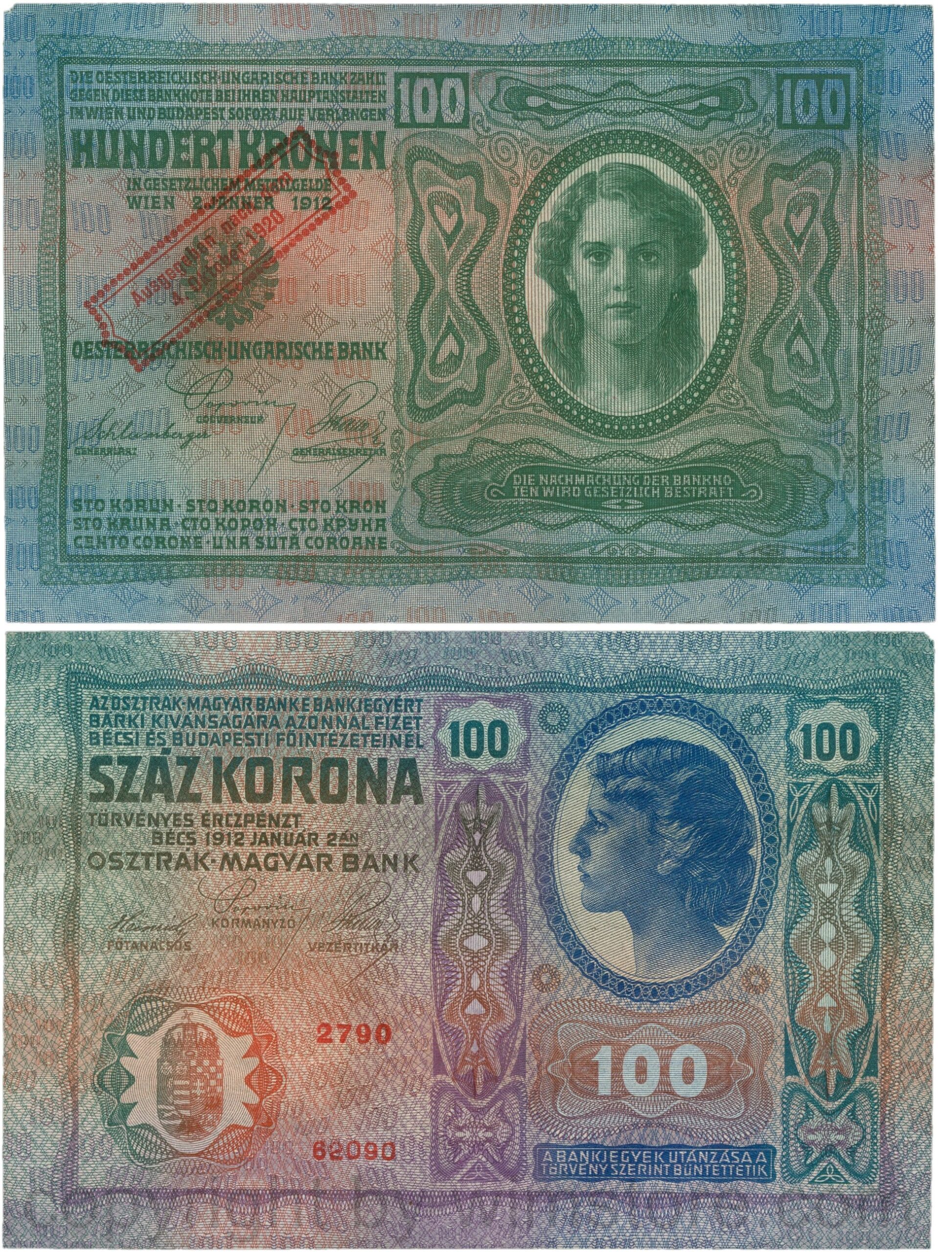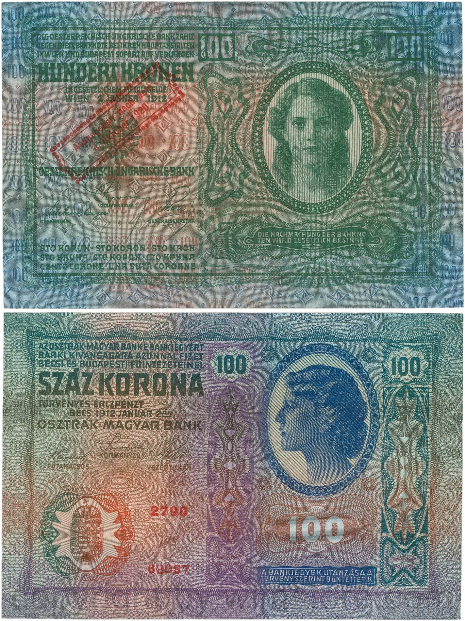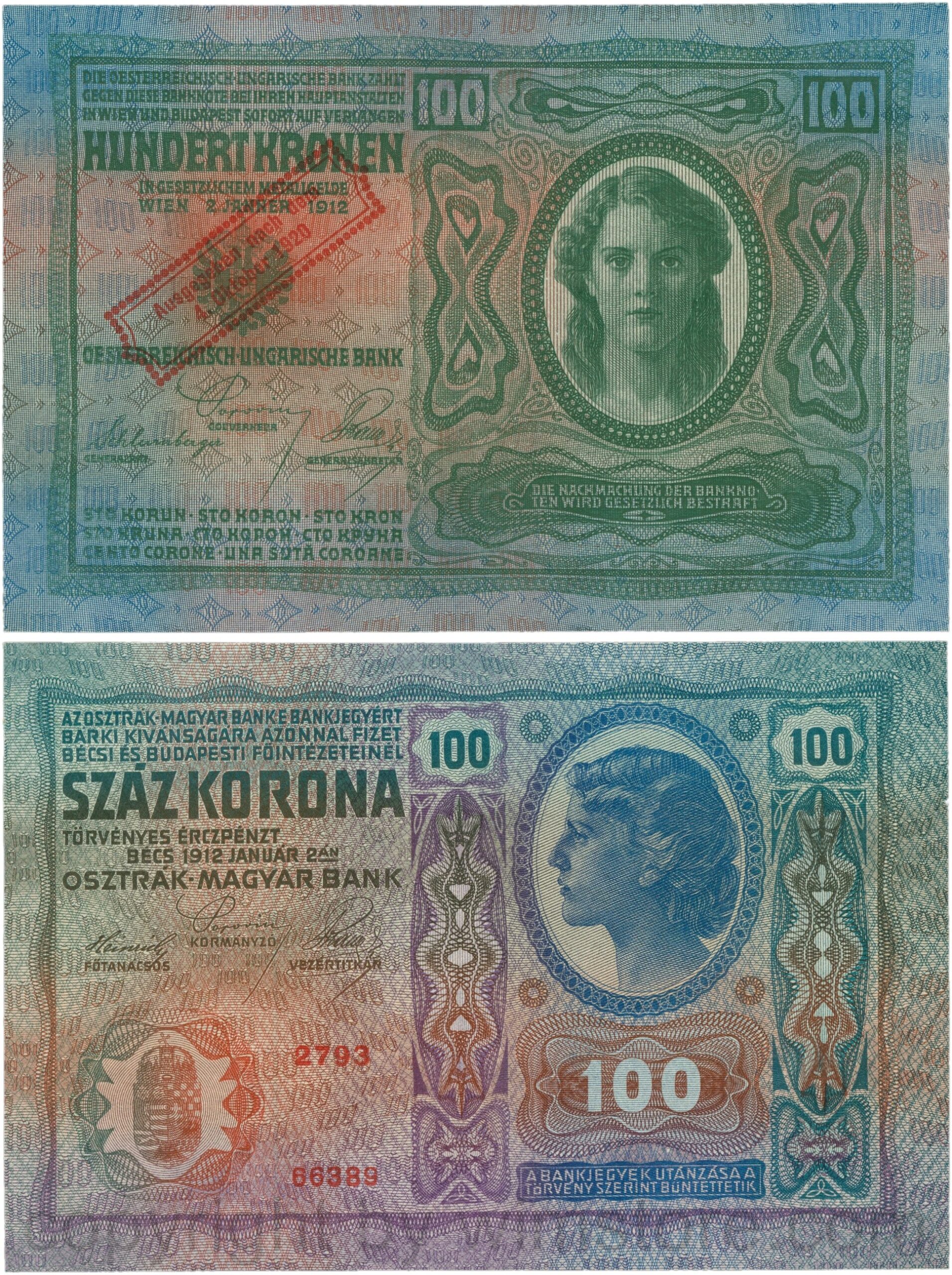 Österreich, 1. Republik, P047, 100 Kronen 1912, Ausgegeben nach dem 4. Oktober 1920; 2 Originalfoto.