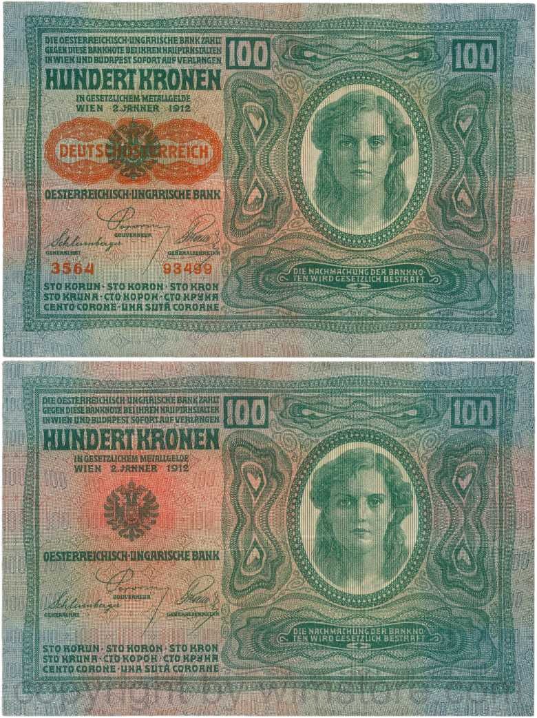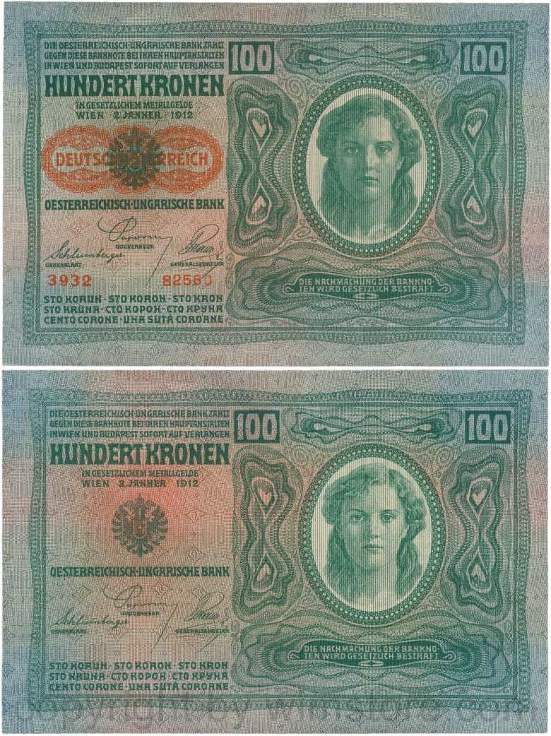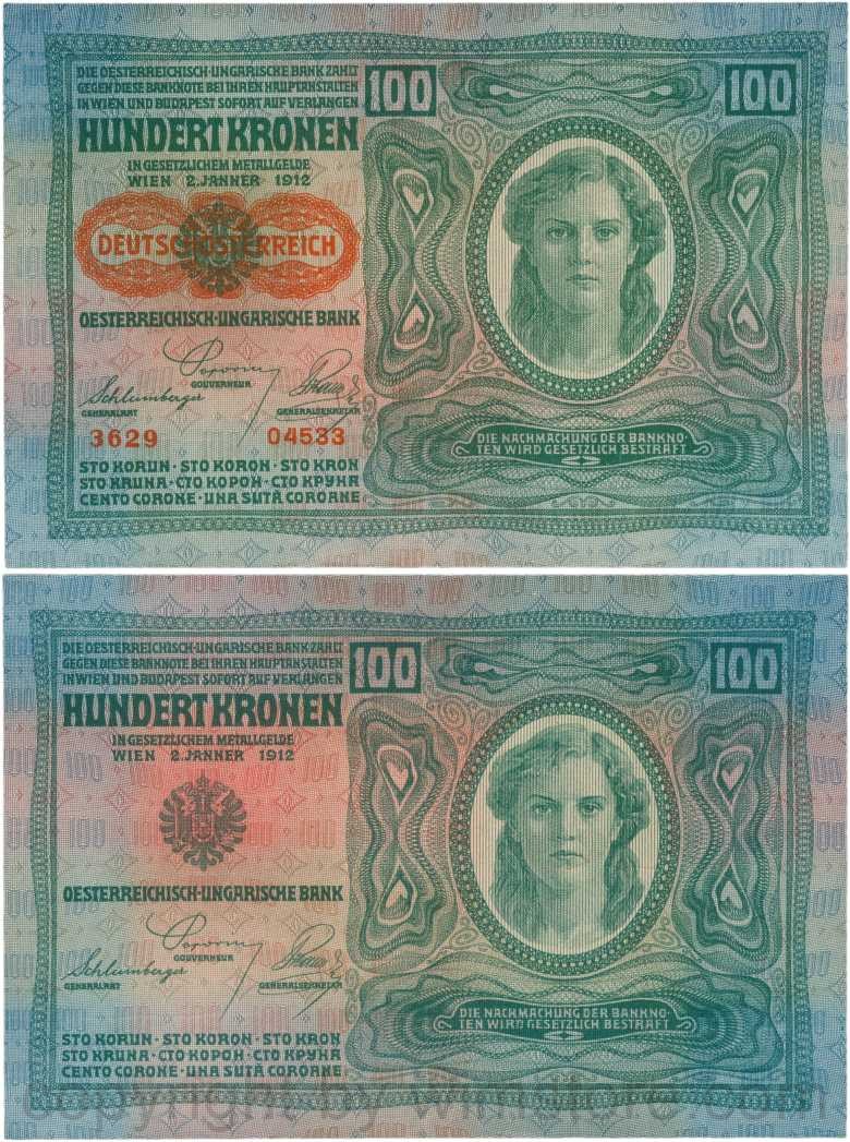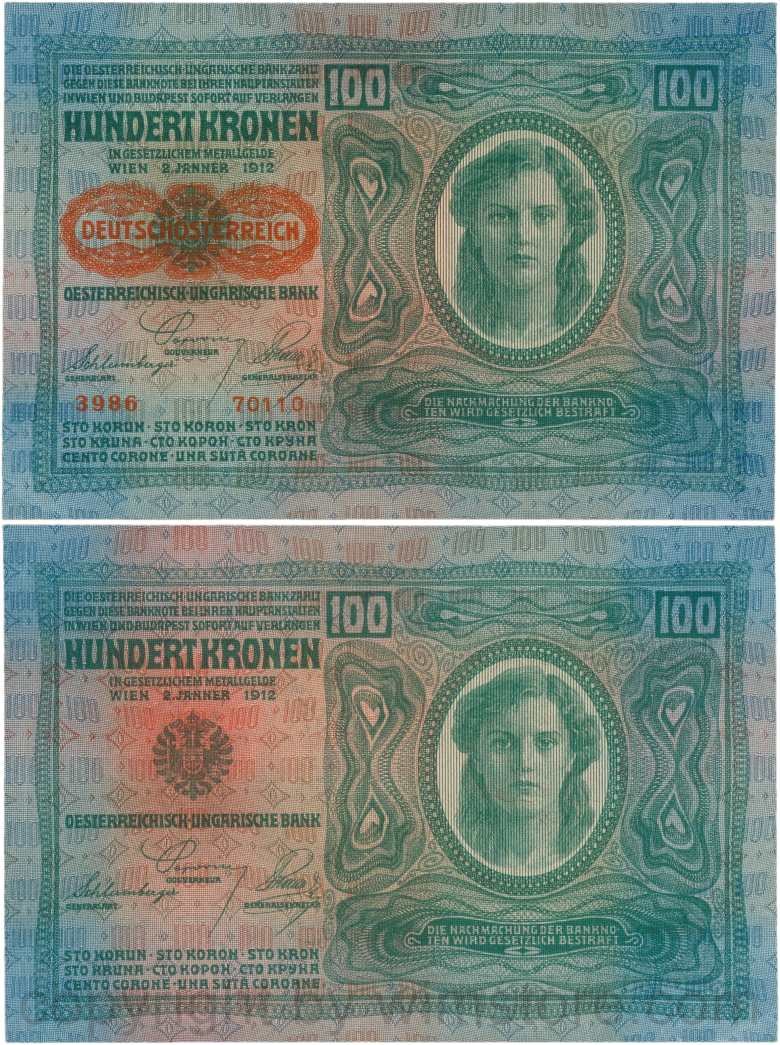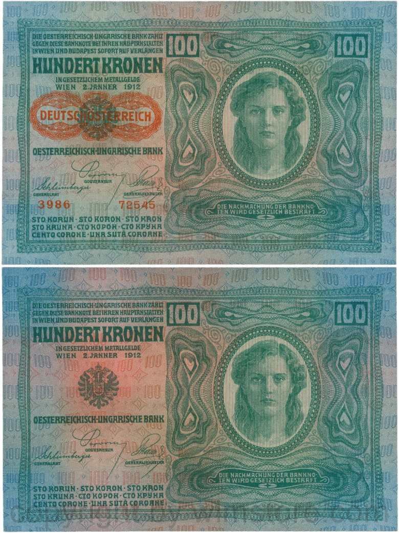 Österreich, 1. Republik, P056.2, 100 Kronen 2.1.1912, Aufdruck "DEUTSCHÖSTERREICH" (1919), dünnes Papier; 2 Originalfoto.