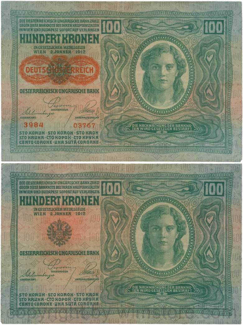 Kaufen Sie eines von Österreich, 1. Republik, P056.2, 100 Kronen 2.1.1912, Aufdruck "DEUTSCHÖSTERREICH" (1919), dünnes Papier; 2 für 12,00 €