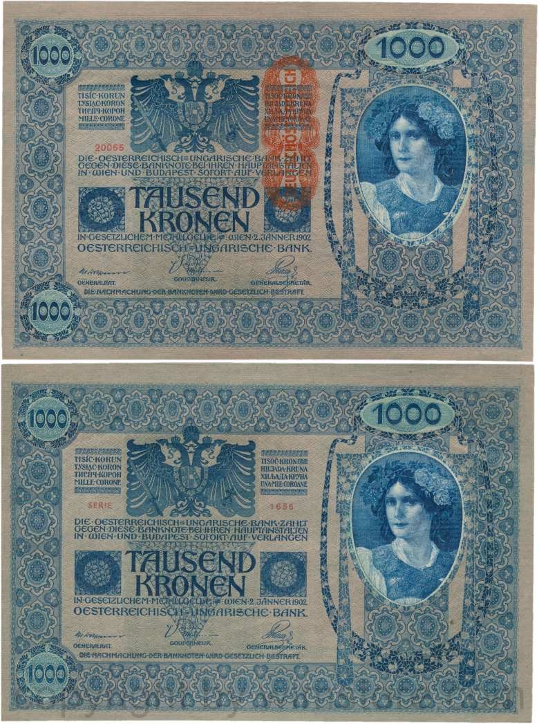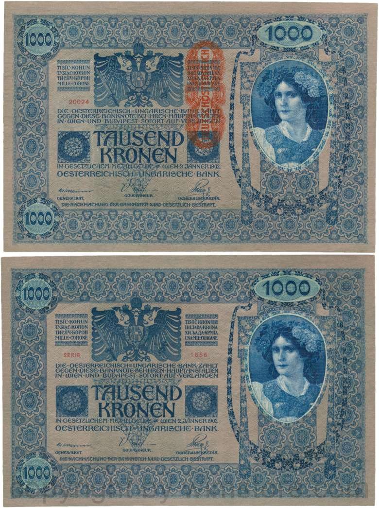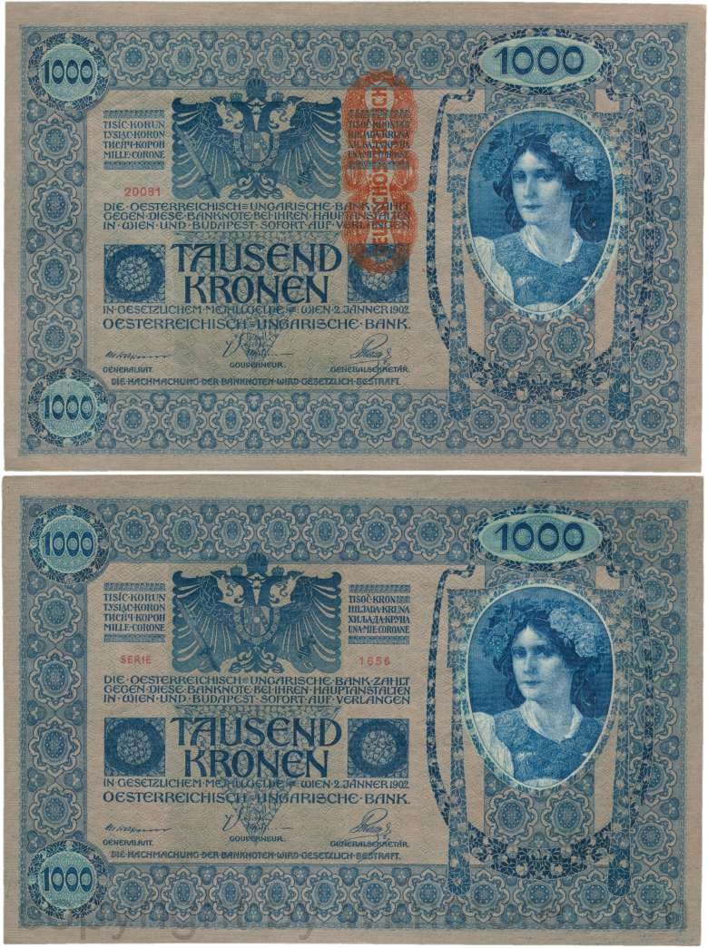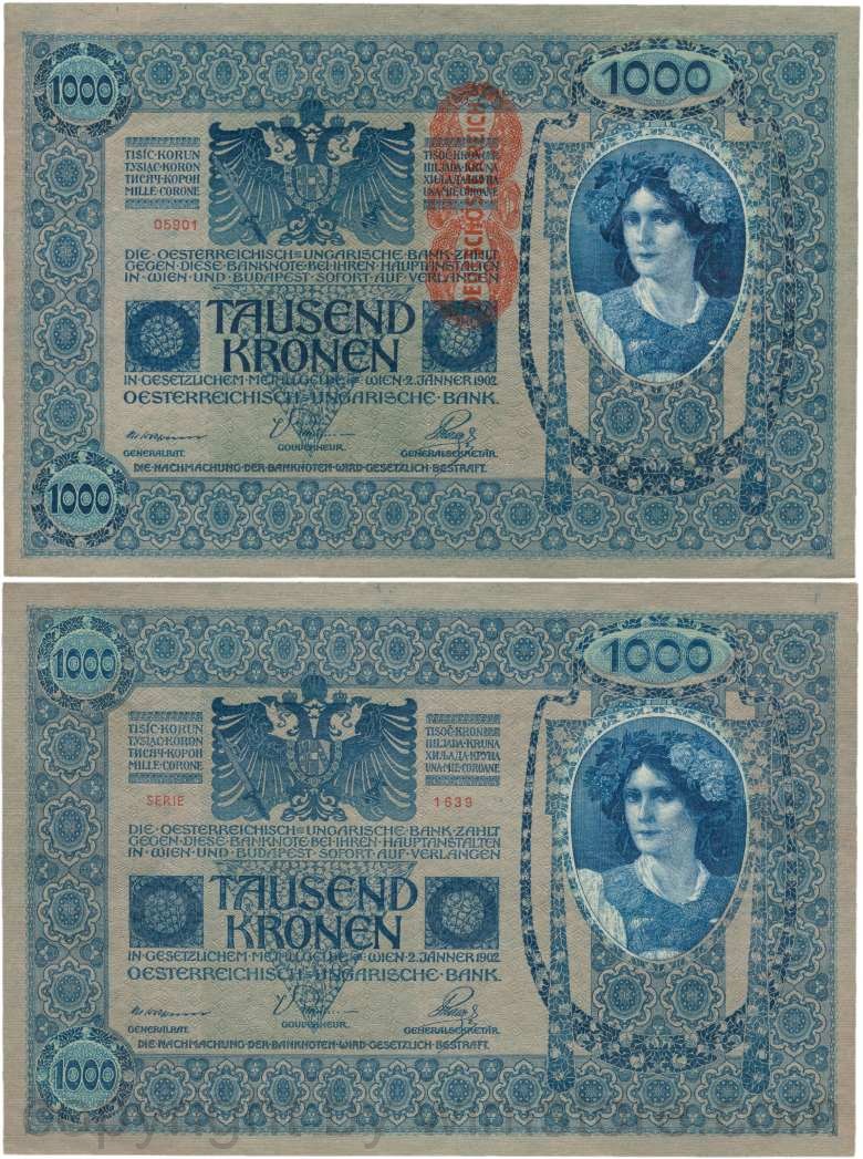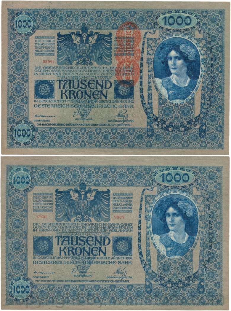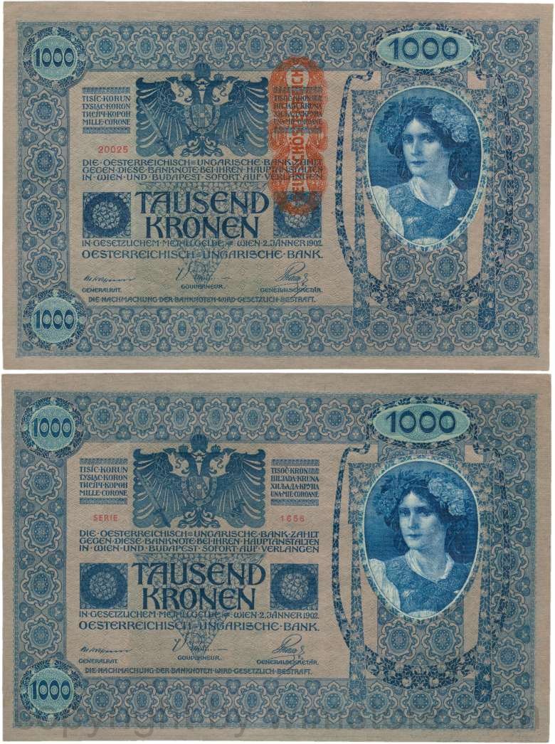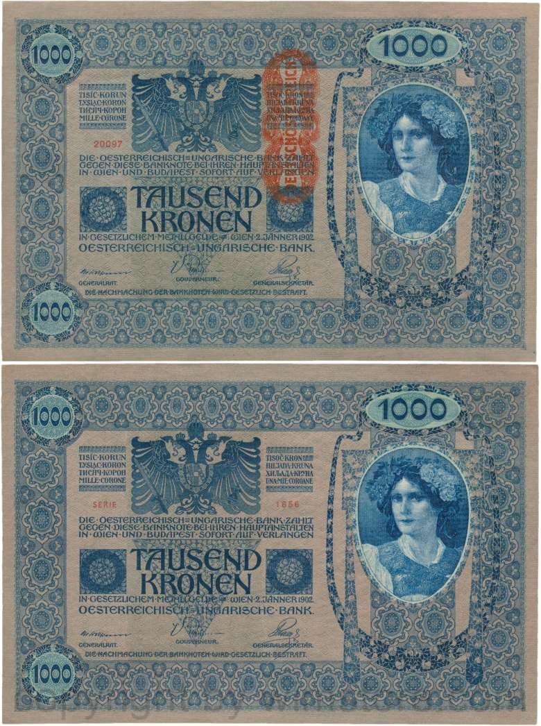 Österreich, 1. Republik, P059, 1000 Kronen 2.1.1902, Aufdruck "DEUTSCHÖSTERREICH" (1919); 2 Originalfoto.