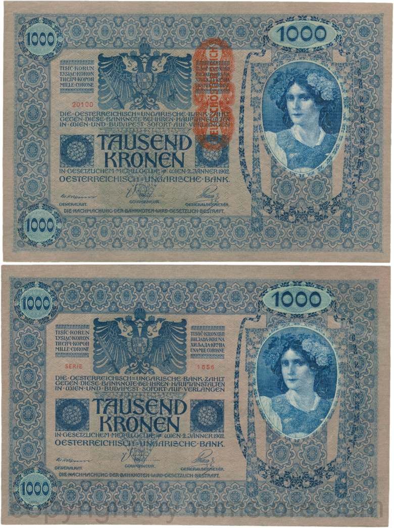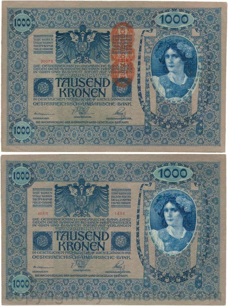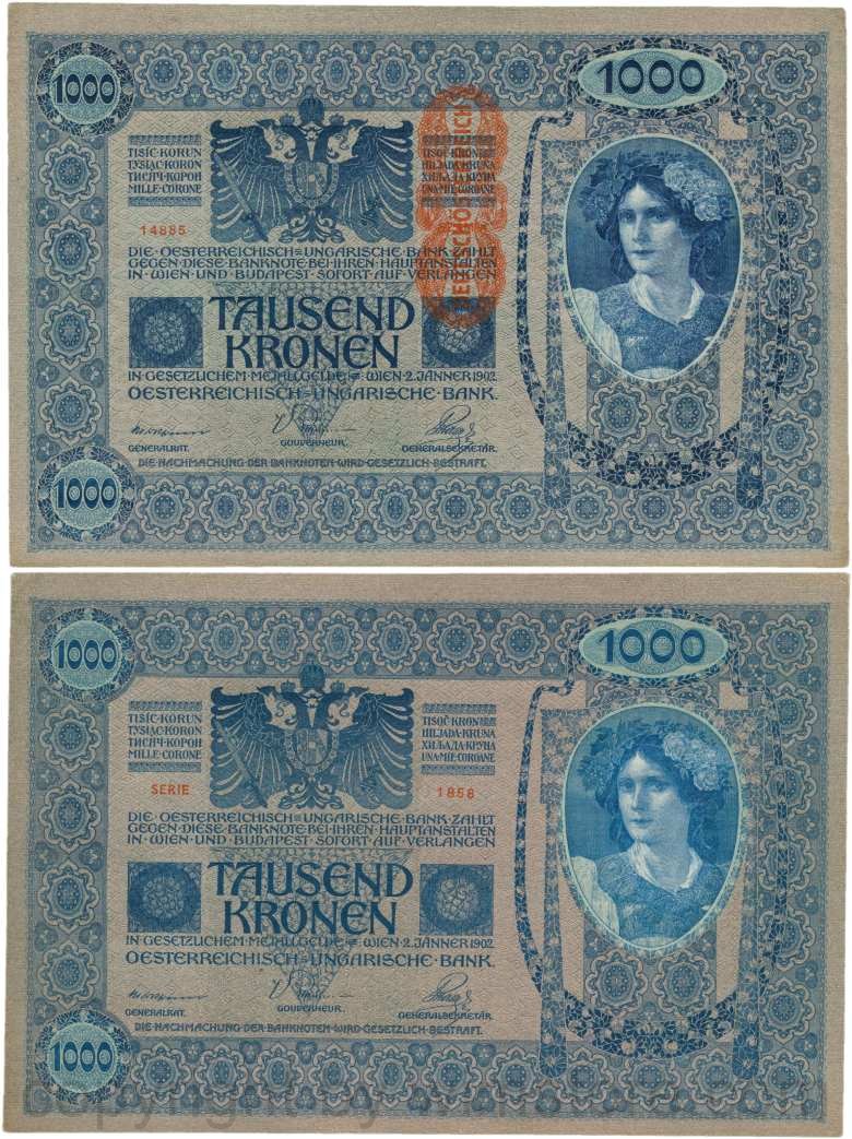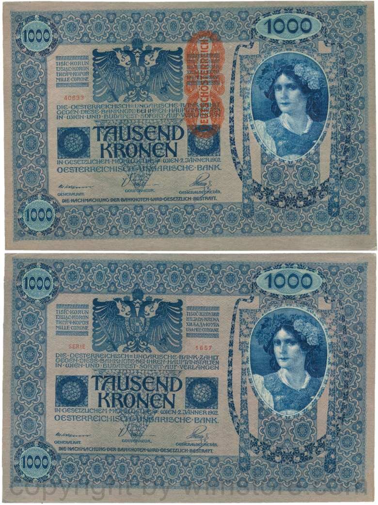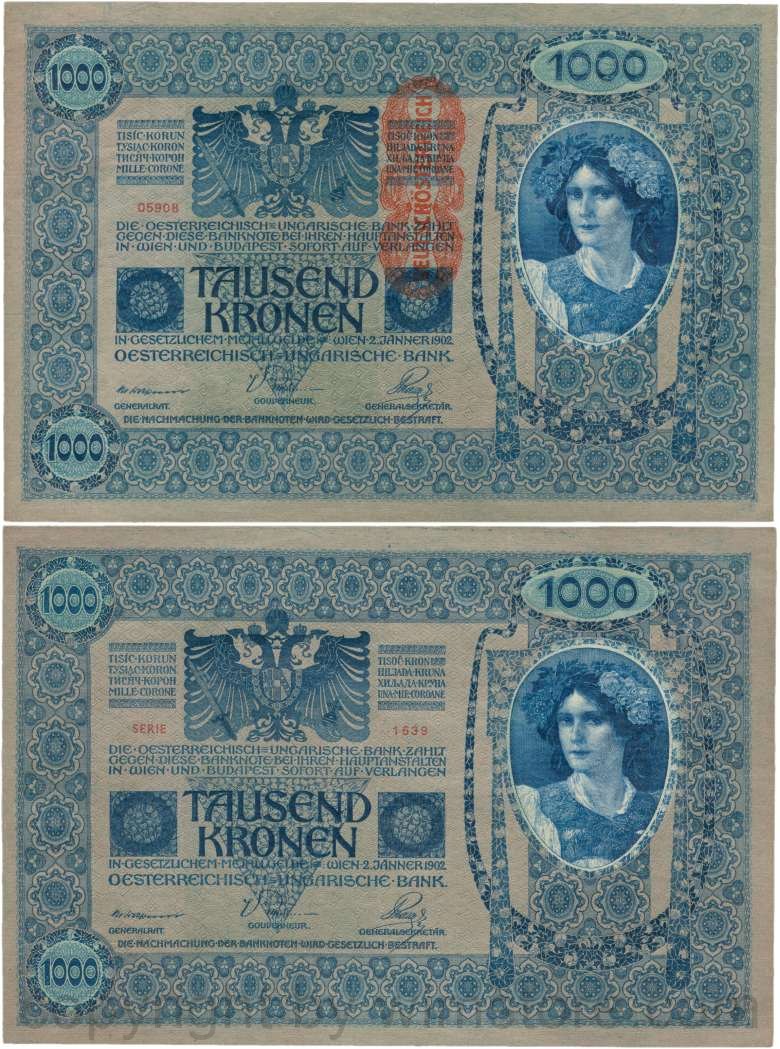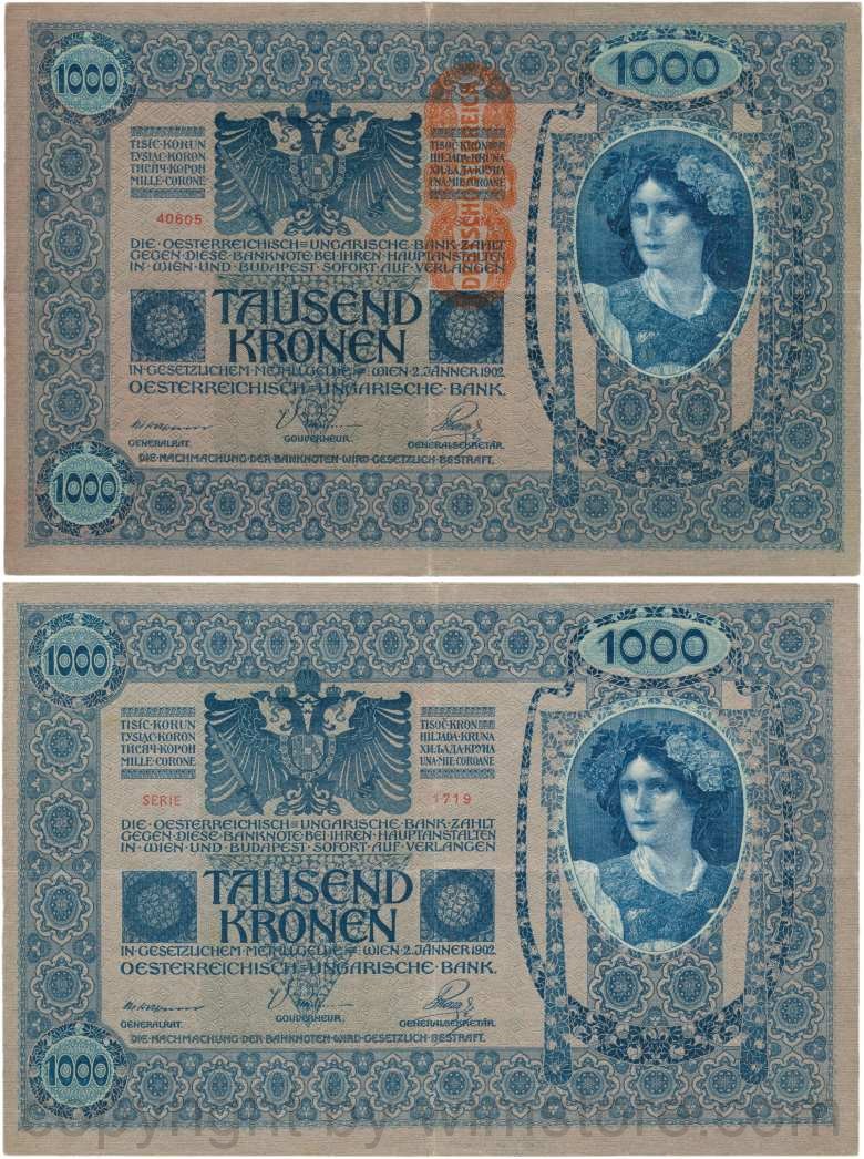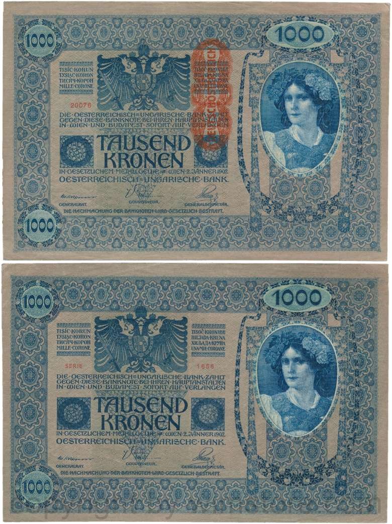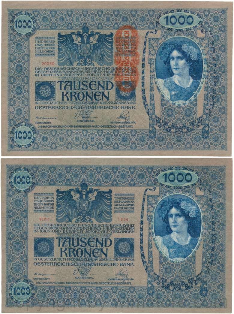 Österreich, 1. Republik, P059, 1000 Kronen 2.1.1902, Aufdruck "DEUTSCHÖSTERREICH" (1919); 2 Originalfoto.